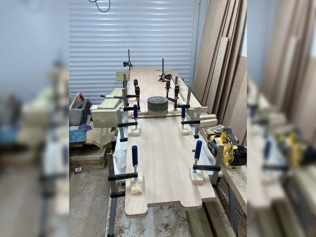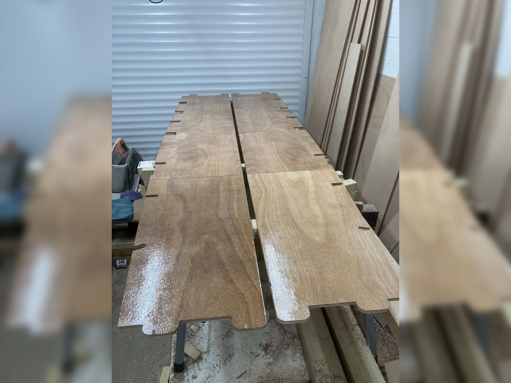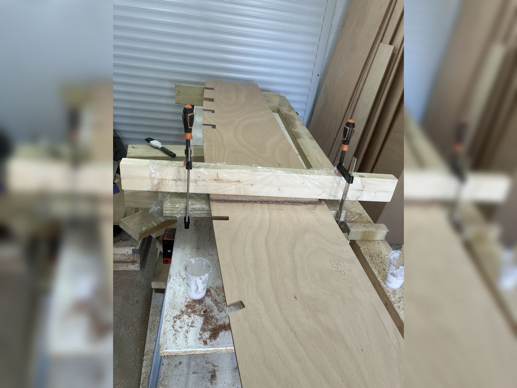 The last job before starting to piece all the various bits together was to put the bunk sides together. This really should have been a very straightforward job however I did manage to stuff it up. For butt joints I've been putting a 45° chamfer on the edges under where the butt block sits to slightly increase the volume of epoxy in the joint. When clamping up the joint this 45° angle caused one of the pieces to become dislodged, which I didn't notice until after the epoxy had cured. That meant that I had to plane off the butt block and cut along the joint line, clean up the joint, and re-do it. As it was the 2nd bunk side that I messed up I used the first side as a template for the second one. Even if they're not perfect they should at least both be the same!