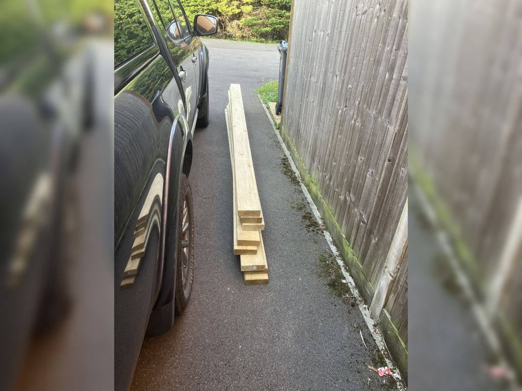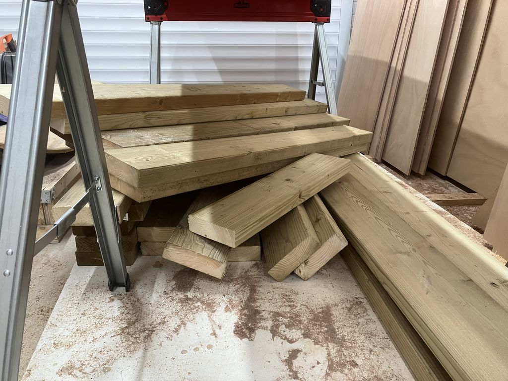 The next job was to build the strongback. I ordered ten 45x145x3600mm beams from Wickes. They were supposed to be kiln-dried but were very wet when they arrived and even after a couple of weeks in the garage one beam was still measuring over 20% moisture content. I did my best to dry them out by using fans to force air up through them which did seem to help.