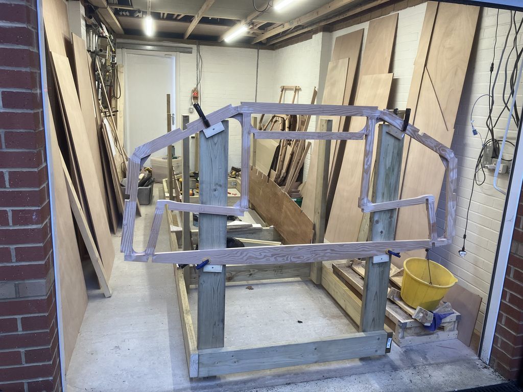 One busy Saturday saw the bulk of the strongback built and the first few frames mounted. Because the space I'm working in is very tight I need to be careful to not end up with pieces that I can't get into place because there isn't enough space to move them - this meant moving the pieces that will be the hull planking into roughly the right place in the garage before constructing the hull, and also mounting frames T, A and D' before putting the strongback structure in place for the frames near the bow.
