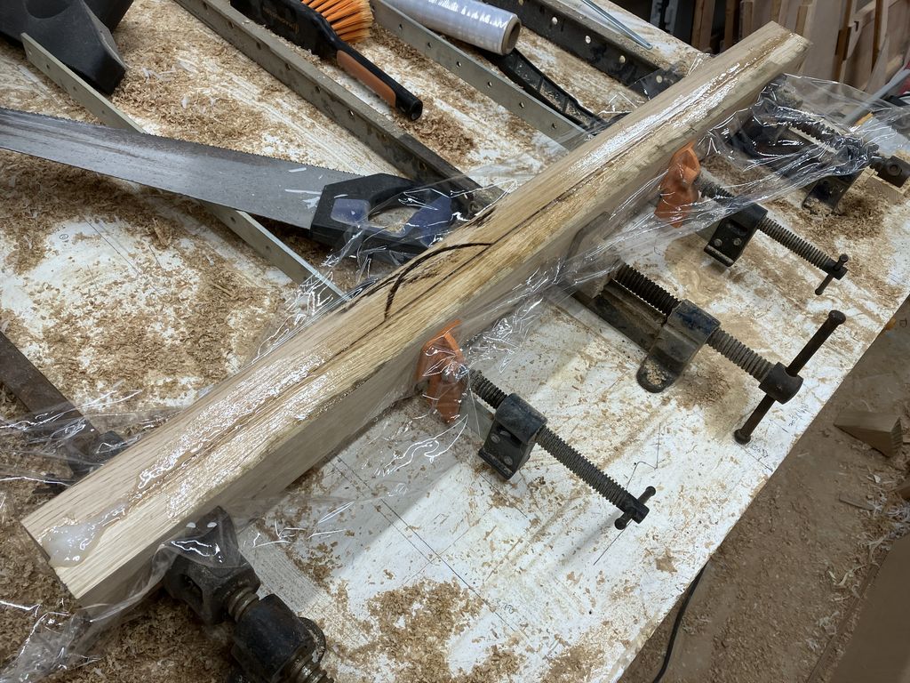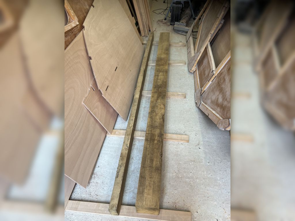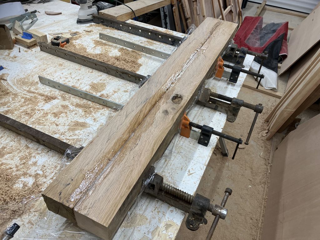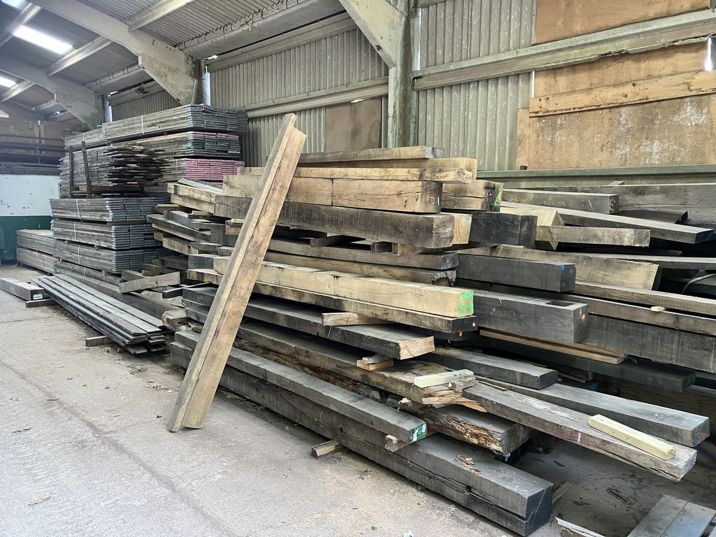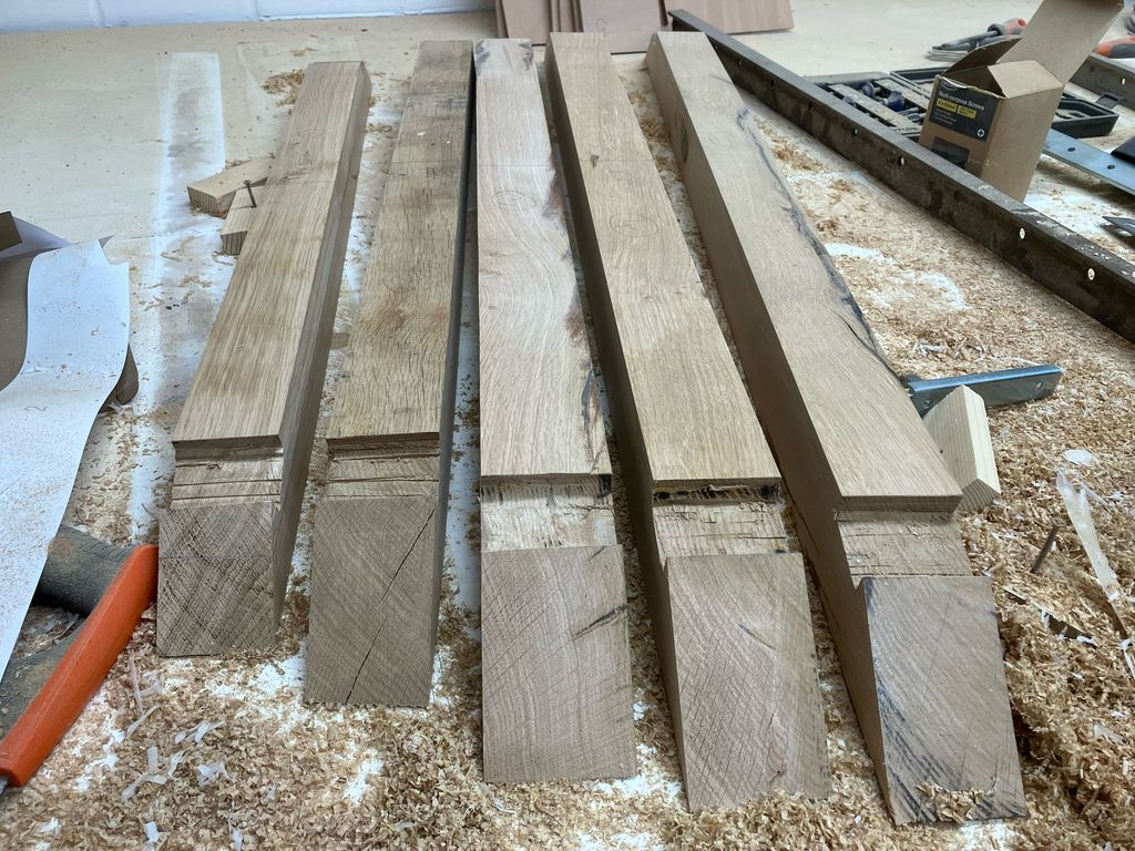 I picked up a couple of oak beams from Romsey Reclamation - one 8'x6"x6" one for £20/ft and 8½'x4"x2" for £10/ft. Total was £288 inc. VAT. These were alledgedly air-dried although I'm not convinced that they had been drying for the 10 years that Romsey suggested - the centre of the beams were certainly not as dry as the outside...